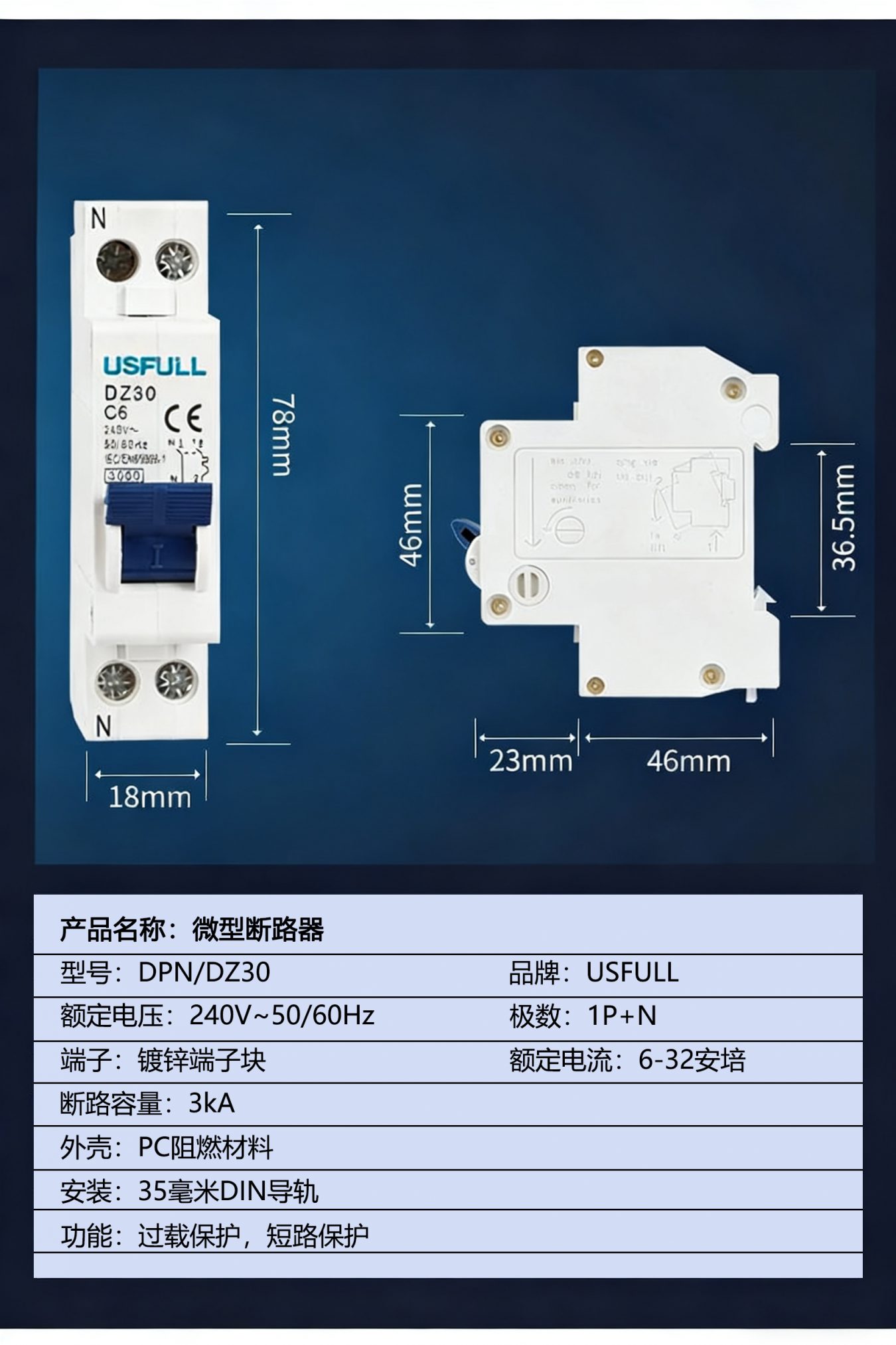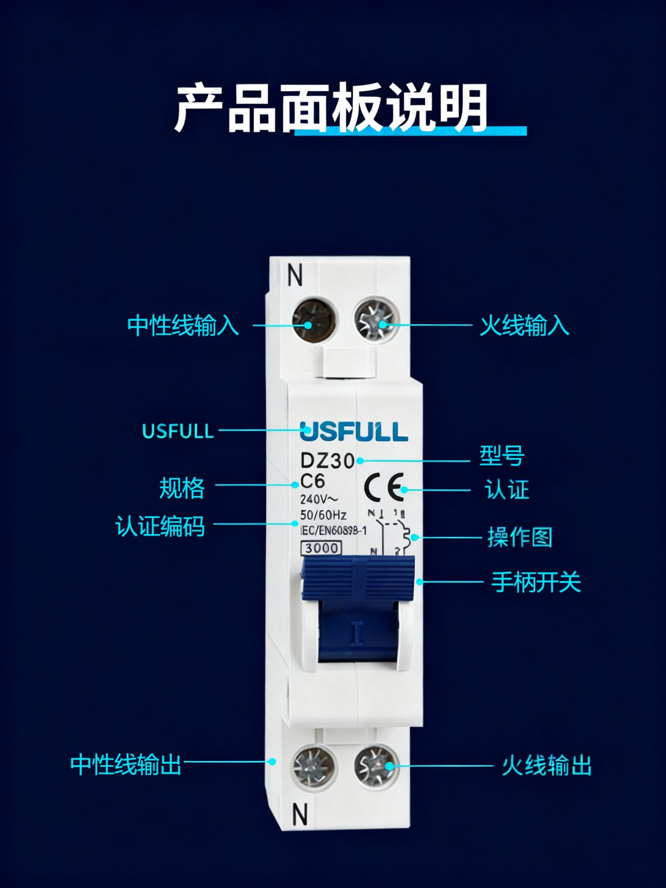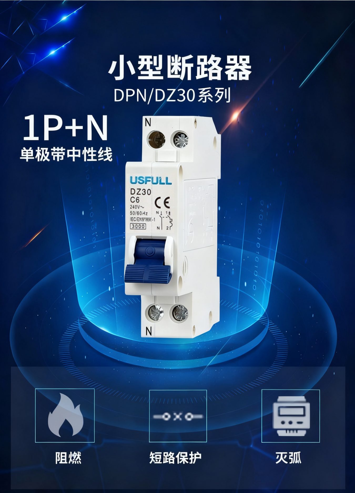 USFULL DPN不仅完全具备传统断路器的全部功能——包括短路保护、过载保护等,更采用了阻燃外壳与高强度灭弧室等强化设计,为您的用电安全提供全方位守护。