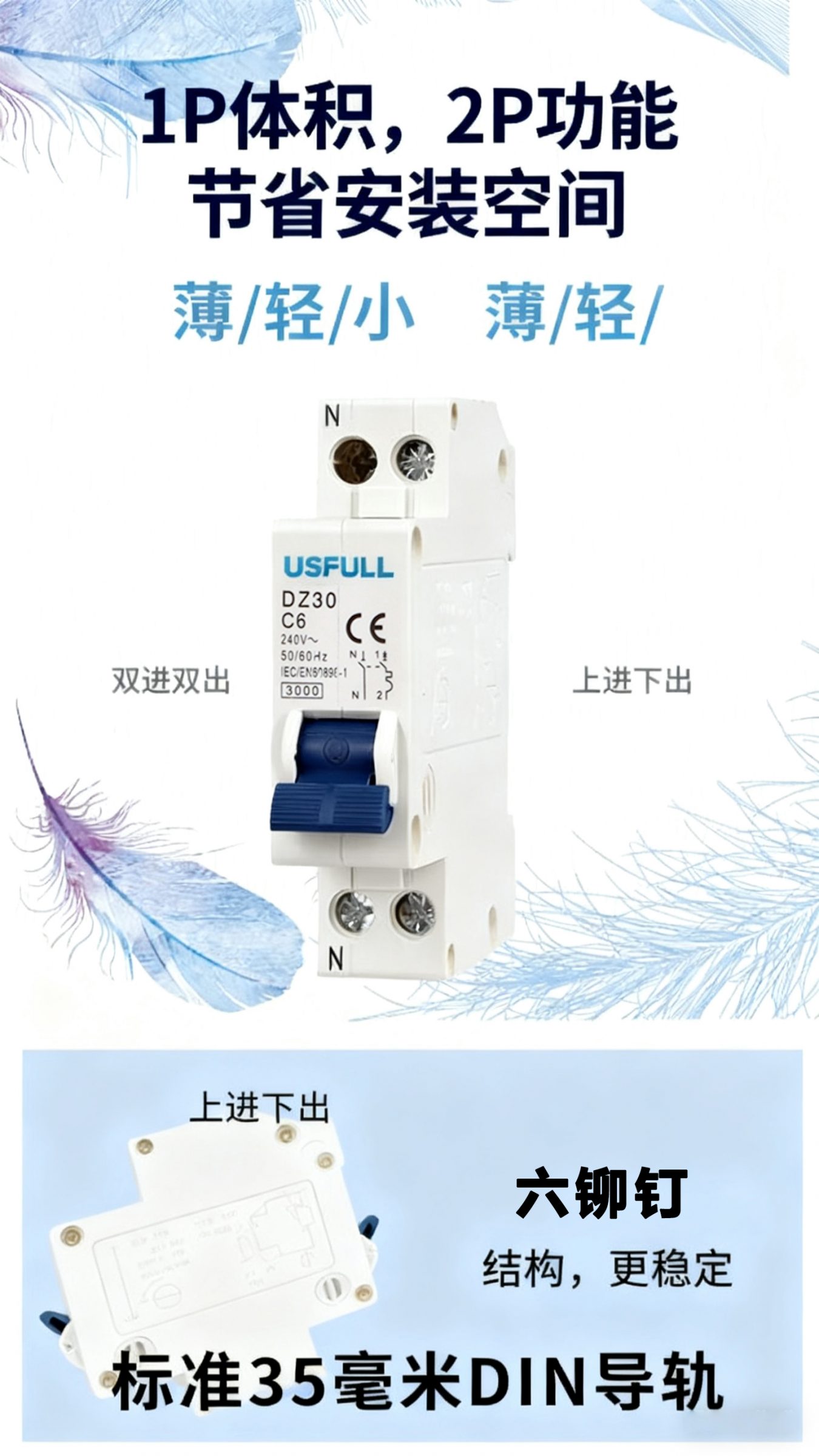 USFULL DPN,或称DZ30,是一种1P+N设计的断路器。其宽度为一个标准模数,具有双极断路器功能。