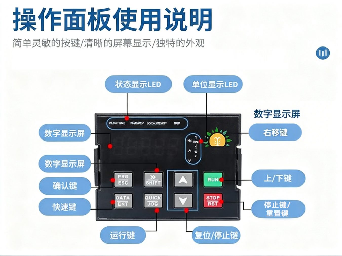 操作面板的直观设计,能够确保用户经过简单培训即可快速了解和掌握变频求的操作方法。