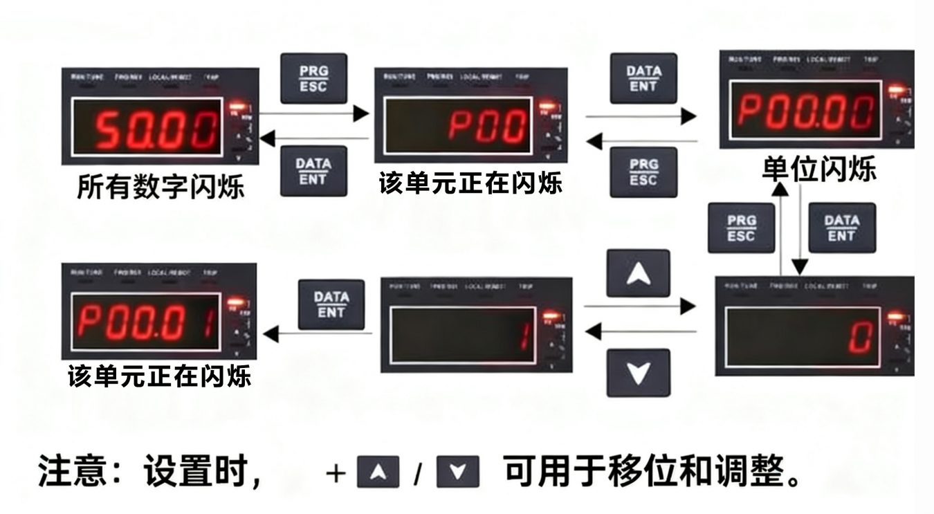 说明:在三级菜单操作中,可按PRG/ESC或者DATA/ENT键返回二级菜单。两者的区别是:按DATA/ENT键将设定参数存入控制板,然后再返回二级菜单,并且自动转移到下一个功能码;而按PRG/ESC键则直接返回二级菜单,不存储参数,并保持停留在当前功能码。