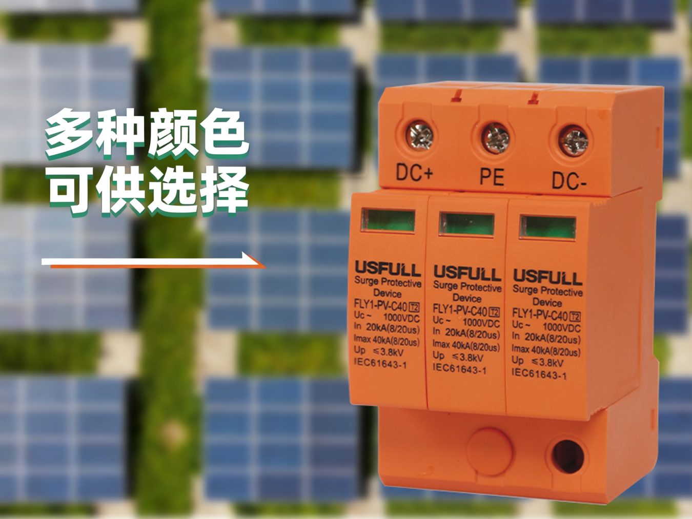 USFULL FLY1-PV 太阳能直流浪涌保护器,专为光伏系统设计,可保护光伏系统和变频器免受雷电影响,从而保护电器设备。