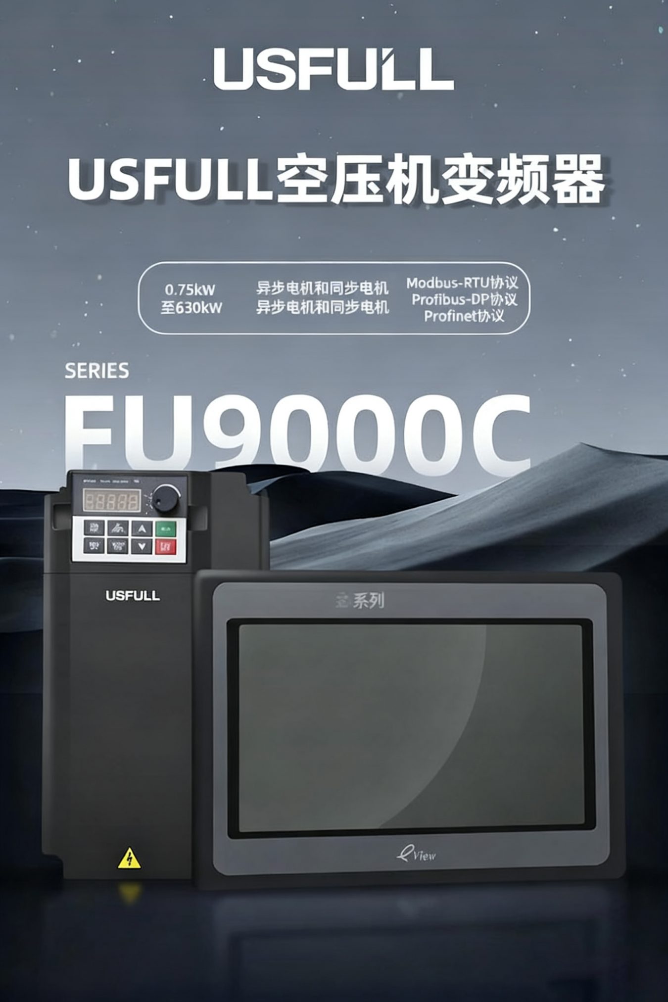 USFULL FU9000C 系列变频器(Variable Frequency Drive,简称 VFD)是专为空压机设计的定制化驱动控制方案,可通过精准的变频技术解决传统空压机的痛点,同时实现显著节能。